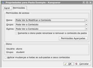 Como foi referido anteriormente, o Konqueror possui como uma de suas funcionalidades a possibilidade de modificar as permissões de acesso a um arquivo. Esta característica permite que uma pessoa possa controlar quem teria acesso a um dado arquivo seu. Por exemplo, se eu quero que apenas a minha pessoa possa ler ou modificar um determinado arquivo, eu posso atribuir a este arquivo as permissões de Read (Leitura) e Write (Escrita), respectivamente, para meu usuário e remover tais permissões para os demais usuários. Para conhecer mais sobre este tema, assista ao tutorial sobre Permissões de Acesso (clique aqui para abrir) ![]() Janela para modificação de Permissões de um arquivo ou pasta.