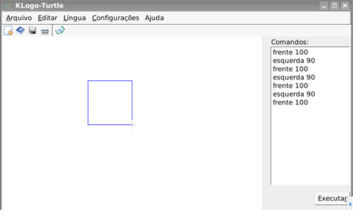 Para que a tartaruga consiga desenhar este quadrado você precisará de dois comandos: FRENTE e ESQUERDA.