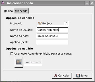 E agora, selecionaremos o protocolo Bonjour, escreveremos um nome de usuário (um apelido-opcional) e, então, clicamos em salvar.