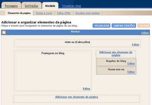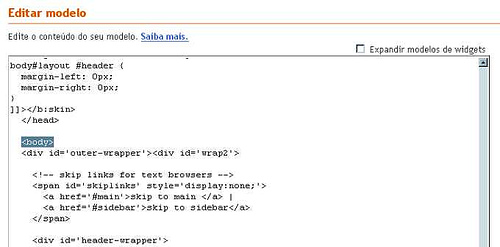 Aqui você pode ver a íntegra da codificação do seu blog e fazer alterações nela. É indicado que apenas usuários muito experientes e com conhecimento de html usem este espaço para fazer modificações.