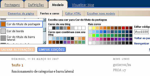 Aqui você mexe com as cores do seu blog e com o tipo de fonte usados nos diversos elementos de página.