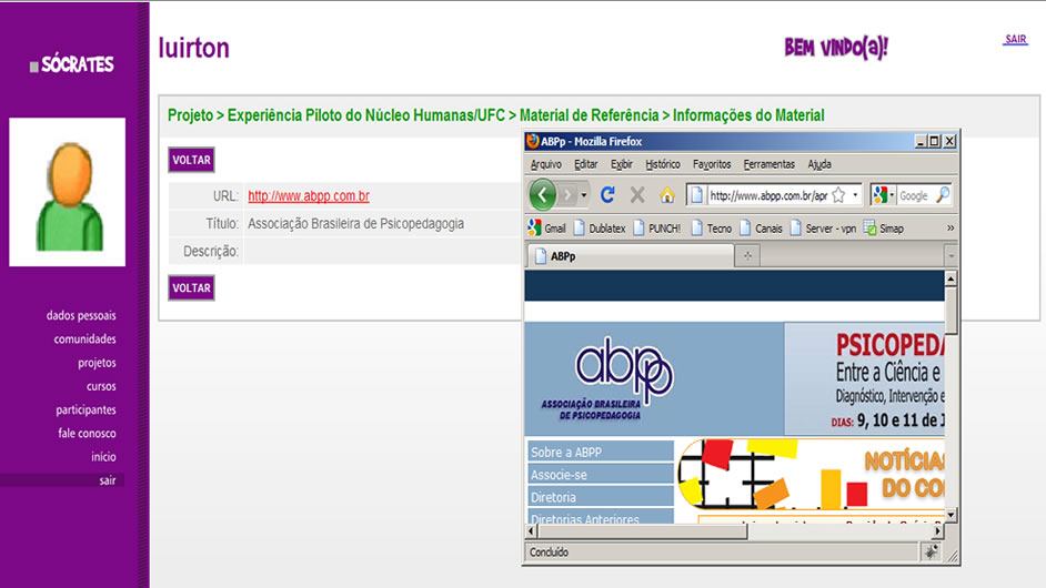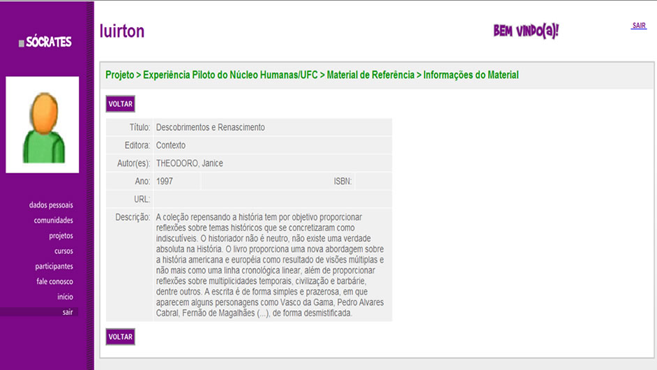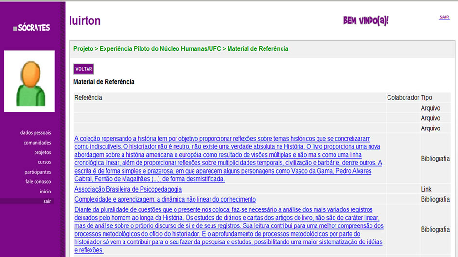 1. Selecionando a opção ‘Material de Referência’, você poderá acessar diversas informações, tais como arquivos, links para outros endereços na web ou referências bibliográficas, cujo conteúdo está relacionado ao projeto, como podemos observar na figura abaixo: