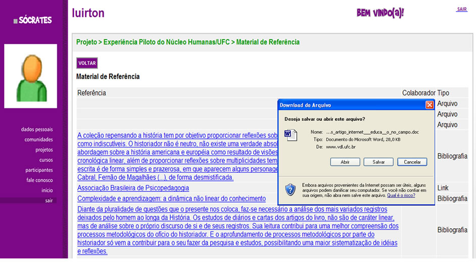3. Clicando-se novamente sobre o nome da referência, o sistema perguntará se você deseja abrir ou salvar o respectivo arquivo para poder acessar o seu conteúdo, como observamos abaixo: