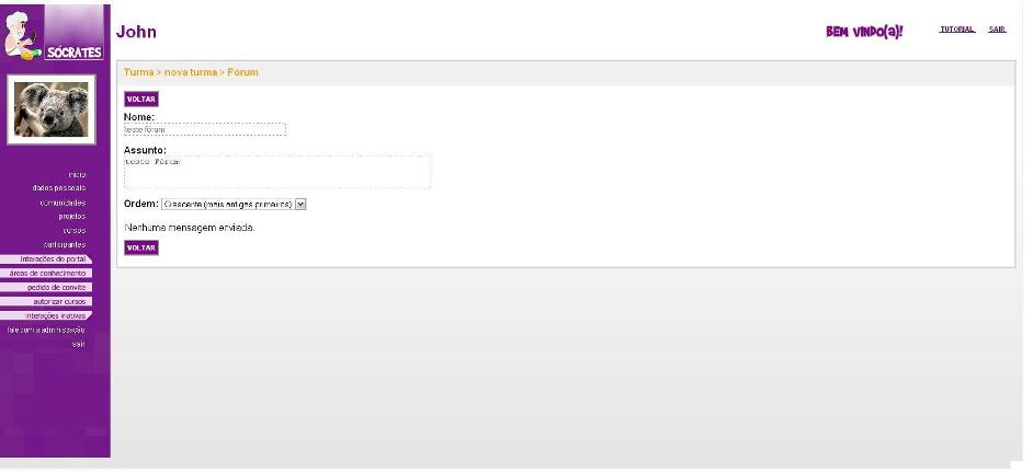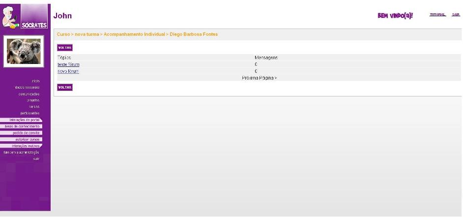 2.Clicando sobre o nome de um dos estudantes, o SOCRATES informa detalhadamente a quantidade de mensagens enviadas para cada um dos fóruns da turma, como podemos observar a seguir: