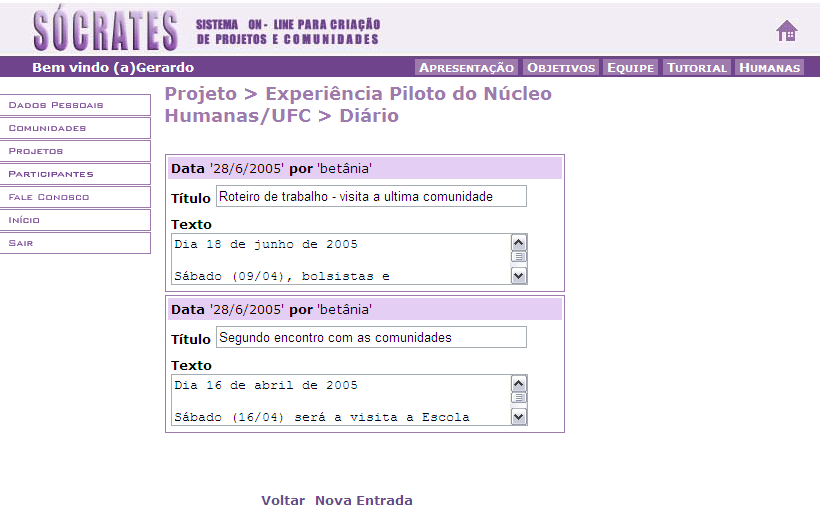 1. Selecionando a opção ‘Diário’ na interface de entrada do projeto, você pode visualizar uma descrição precisa das atividades e eventos ocorridos durante o processo de realização de um dado projeto, como pode ser observado na figura abaixo: