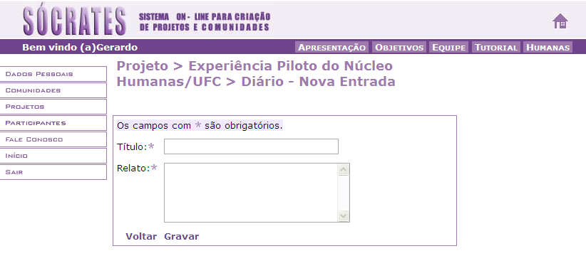 3. Você também pode acrescentar informações ao diário do projeto, selecionando a opção ‘Nova Entrada’ na tela correspondente à figura apresentada acima. Em seguida, a tela abaixo será exibida: