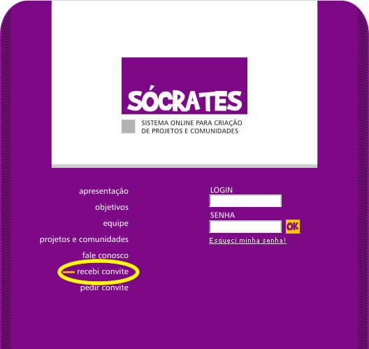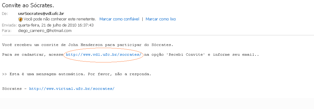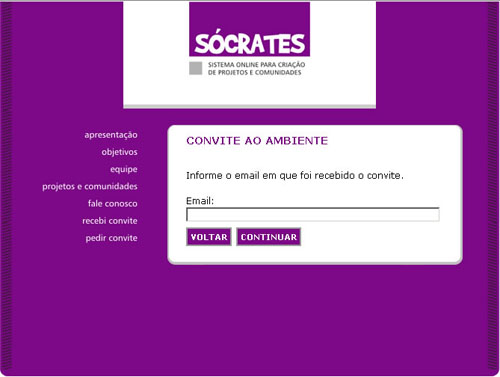 Nesse caso, certifique-se do endereço de e-mail correto para o qual o convite foi enviado e repita o procedimento de cadastramento no Portal. Verifique também se o seu cadastro realmente ainda não foi efetivado, caso contrário, realize a conexão ao ambiente, de acordo com os procedimentos descritos na seção ‘Conectando-se ao SÓCRATES’ deste tutorial.