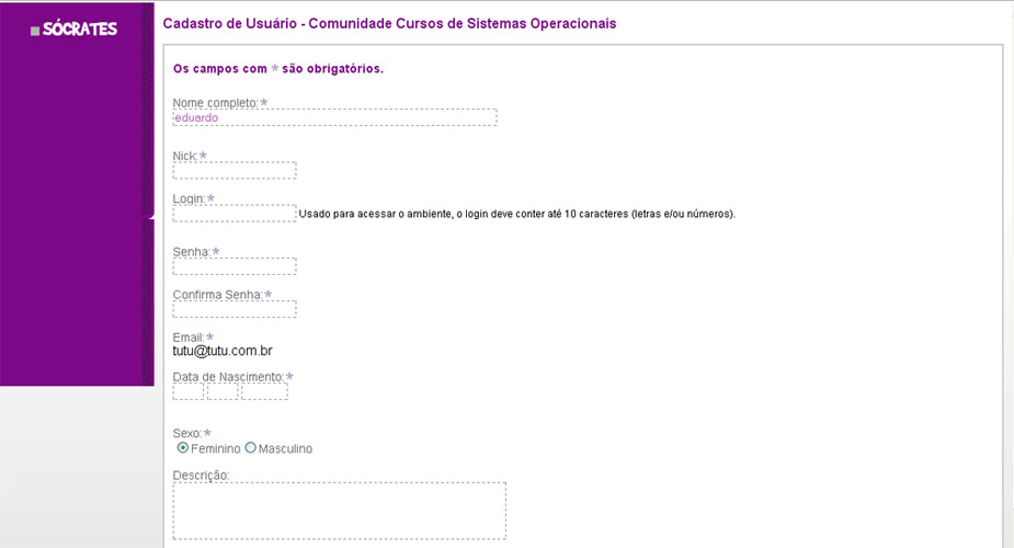 Tendo preenchido seus dados pessoais, você será novamente direcionado à página de entrada do SÓCRATES, devendo realizar sua conexão antes de continuar a utilizar os recursos do portal.