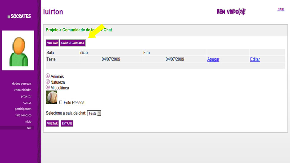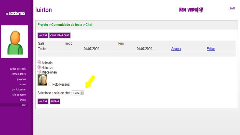 2. Antes de entrar na sala, selecione uma figura ou foto pessoal para representar você no ambiente do bate-papo. Depois disso, selecione a opção ‘Entrar’. O sistema exibirá a sala de bate-papo, permitindo que você se comunique com os demais participantes do Chat.