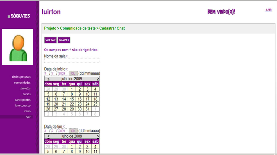 Determine o nome da sala, de acordo com o assunto abordado. Defina também a Data de Início e a Data de Fim da sessão de bate-papo, através dos calendários disponibilizados na tela. Além disso, informe os horários de início e conclusão da sessão.