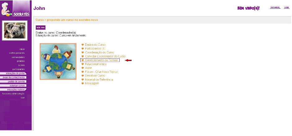 Para criar uma nova turma, vá até a página inicial do seu curso no SOCRATES e clique na opção Gerenciamento de turmas.