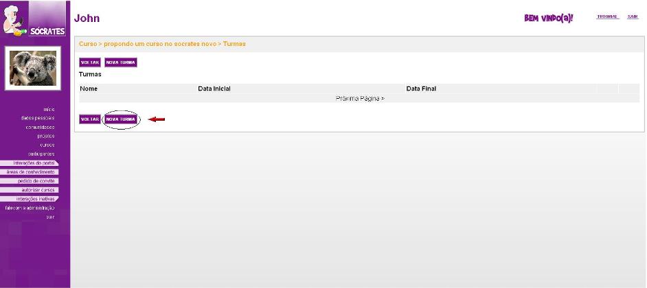 Em seguida, clique no botão “NOVA TURMA” que aparecerá na tela como mostrado abaixo: