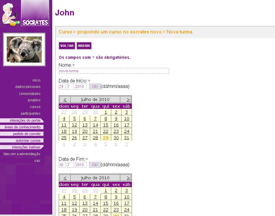 Na tela seguinte, defina o nome da turma e a data do início e do final de funcionamento da mesma. Faça também uma descrição da turma correspondente e defina uma imagem representativa para esta turma, caso assim o deseje.