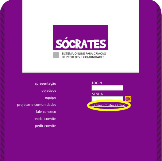 1. No caso de você esquecer sua senha de acesso, selecione a opção ‘Esqueci minha senha!’ na tela de entrada do SÓCRATES, conforme a figura: