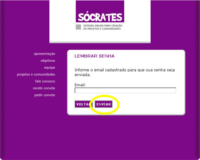 Selecione a opção ‘Enviar’ para que o sistema encaminhe novamente sua senha para o seu endereço de e-mail.