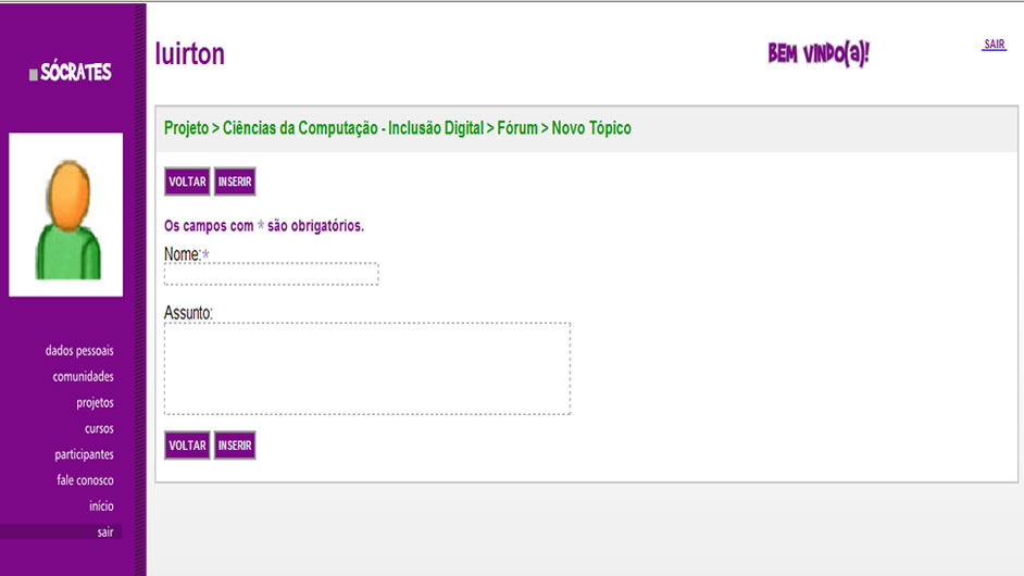 1. Como integrante de um projeto, você pode ainda criar um fórum que trate de um tema relevante para o grupo. Para criar um fórum, selecione a opção ‘Novo Fórum’ na interface do projeto do qual você faz parte. A seguinte tela será exibida: