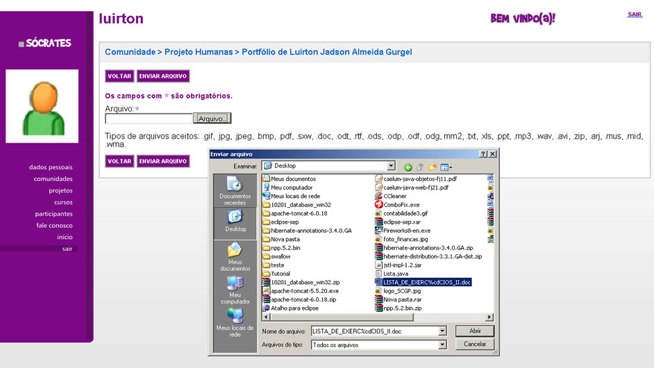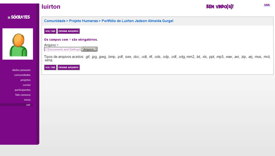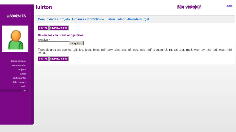 1. Uma vez fazendo parte de uma comunidade, você pode inserir material bibliográfico ou produção textual em seu portfólio na forma de arquivos, tornando-os disponíveis para os demais membros da comunidade. Para isso, selecione a opção ‘Enviar Arquivo’ na página de portfólio da respectiva comunidade.