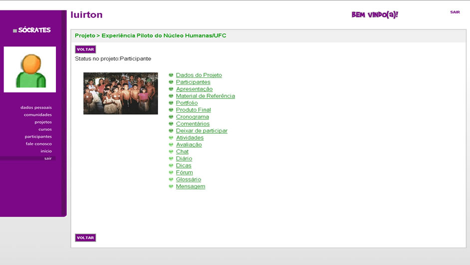 No interior da caixa denominada ‘Meus Projetos’ estão relacionados os projetos dos quais você faz parte. Clicando sobre o nome de um deles, será exibida uma página correspondente ao projeto selecionado, conforme exemplificado abaixo: