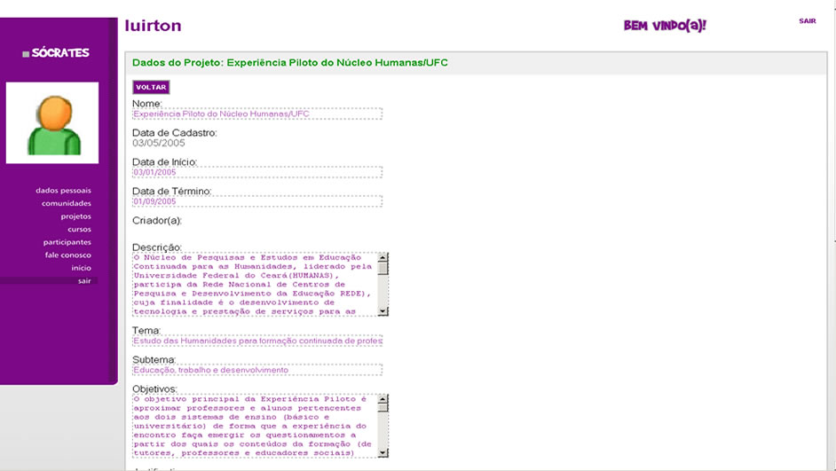 Clicando na opção ‘Dados do Projeto’ será apresentada uma página exibindo os objetivos e as atividades do projeto selecionado, como vemos na figura abaixo: