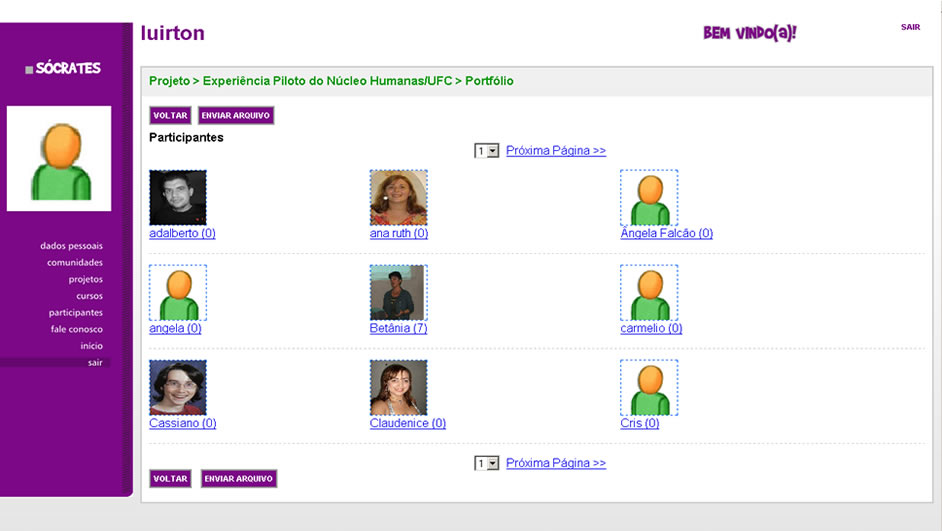 Selecionando a opção ‘Portfólio’, o sistema apresenta novamente a relação dos membros participantes do projeto, juntamente com uma indicação da quantidade de material disponibilizado em cada portfólio individual, como podemos verificar na figura seguinte: