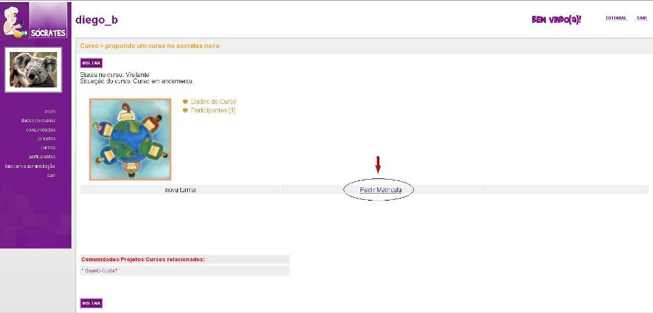 Selecione o curso e a respectiva turma na qual você deseja ingressar, clicando sobre o nome dela na tela de gerenciamento de turmas disponível no SÓCRATES. Em seguida, o sistema exibirá a seguinte página de acesso: