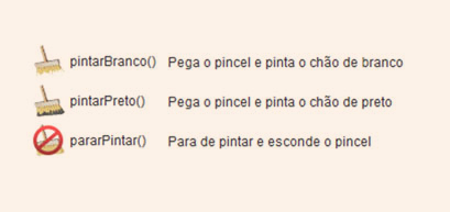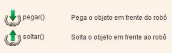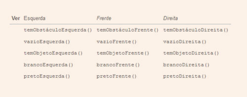 As instruções acima verificam se tem algo em alguma direção. Por exemplo, a função temObjetoEsquerda() verifica se tem algum objeto à esquerda do robô. Outro exemplo, a função brancoFrente() verifica se existe cor branca na frente do robô.