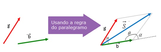 Usando a regra do paralelogramo, determina-se graficamente o vetor resultante. O módulo do vetor R é determinado pela Lei dos Cossenos.