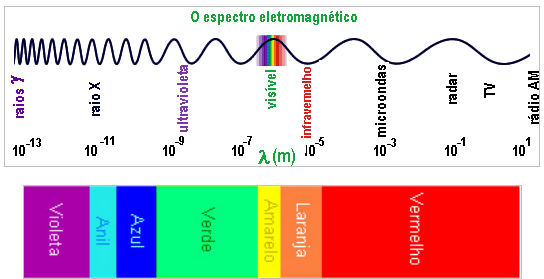 A figura acima representa o espectro eletromagnético que incluem ondas de radio de grande comprimento de onda ate raios gama de comprimento de onda muito curto.